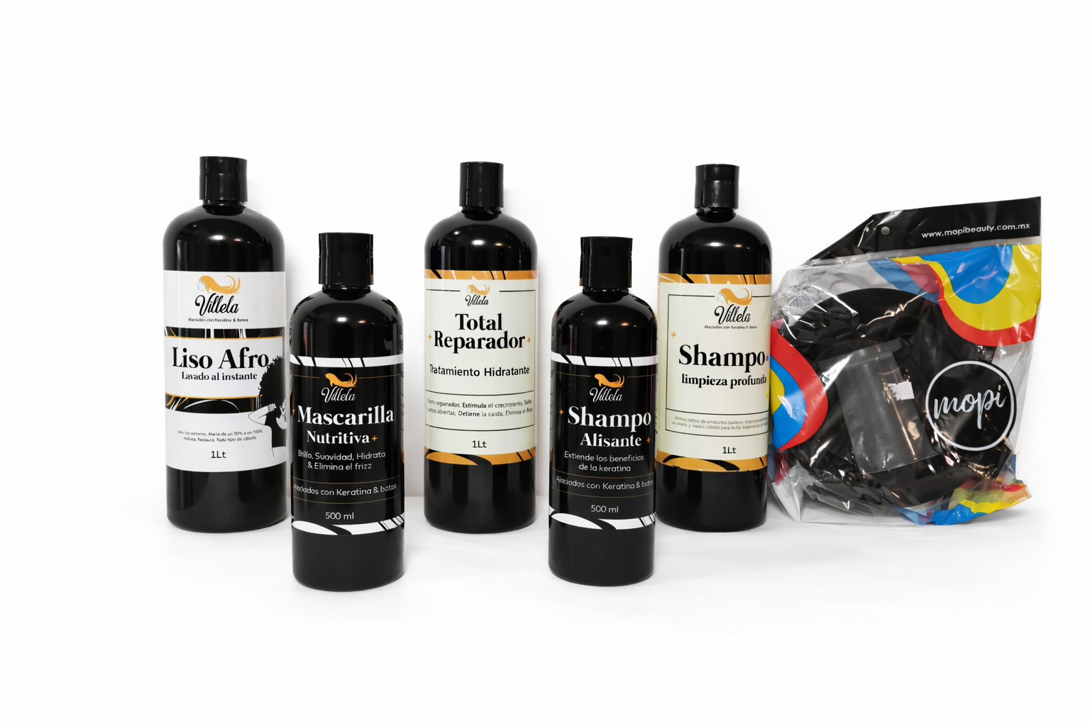 Kit de inicio incluye total reparador 1lt liso afro 1lt shampoo limpieza profunda 1to kit de mantenimiento de 500ml C/U kit aplicador.